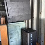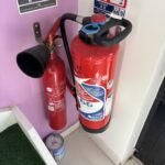 Enseigne sur panneau aluminium – Carbet bois extérieur arrière de 6×4 – Bureau en structure aluminium et baie vitrée avec charpente pin d’escalier (environ 20 m2) et 6 extincteurs