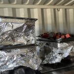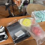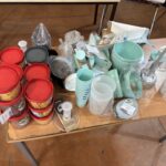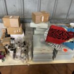 2 Bureaux stratifié – Caisson – Etagère métallique démontée – Tableau blanc – 2 Tréteaux et planches – 2 Sacs de transport avec dispositifs de prises de photos NEEWER – 8 Bidons PVC – 4 Seaux à champagne – Seau à glace – Bac gastronomique