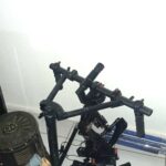 un agencement mural métallique doré formant porte cintres à vêtements et tablettes