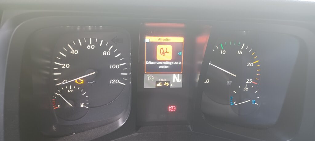MERCEDES ACTROS 3251 BLUE TEC 6 CAMION BENNE MEILLER 8X4 – 2018 – 207 280KM – VCD – VE2 – RE – ORDI DE BORD – RADIO – RLV – BVA – VOYANTS MOTEUR, SERVICE, DEFAUT VERROUILLAGE CABINE ALLUMÉS